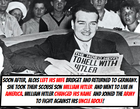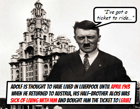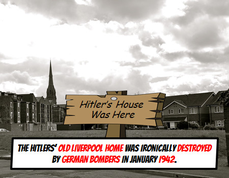 Soon after, Alois left his wife Bridget and returned to Germany. She took their scouse son William Hitler and went to live in America. William Hitler later changed his name to Houston and joined the Army to fight against his Uncle Adolf! In January 1942, during the war, the Hitlers’ old home in Liverpool was destroyed by German bombers.
