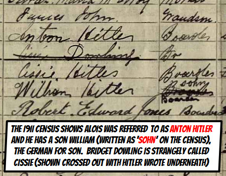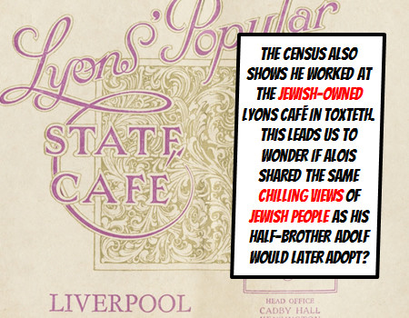 In the 1911 Census, Alois was listed as Anton Hitler. There is also a son listed (written as ‘sohn’ on the census). Perhaps this is Alois' German spelling of Son? The census also shows he worked at the Jewish-owned Lyons Café in Toxteth.